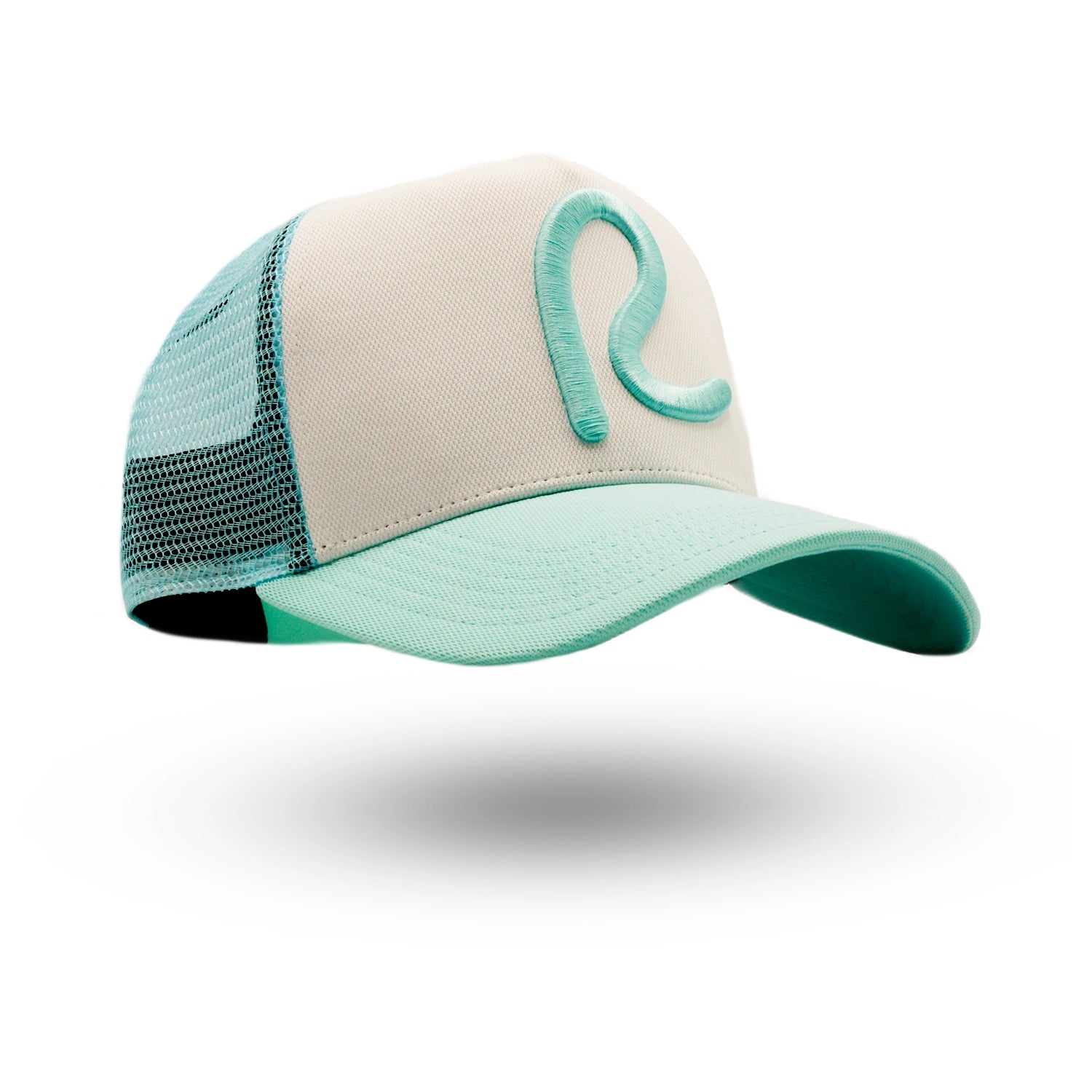 - Aqua blue trucker with aqua blue R logo and white front panel